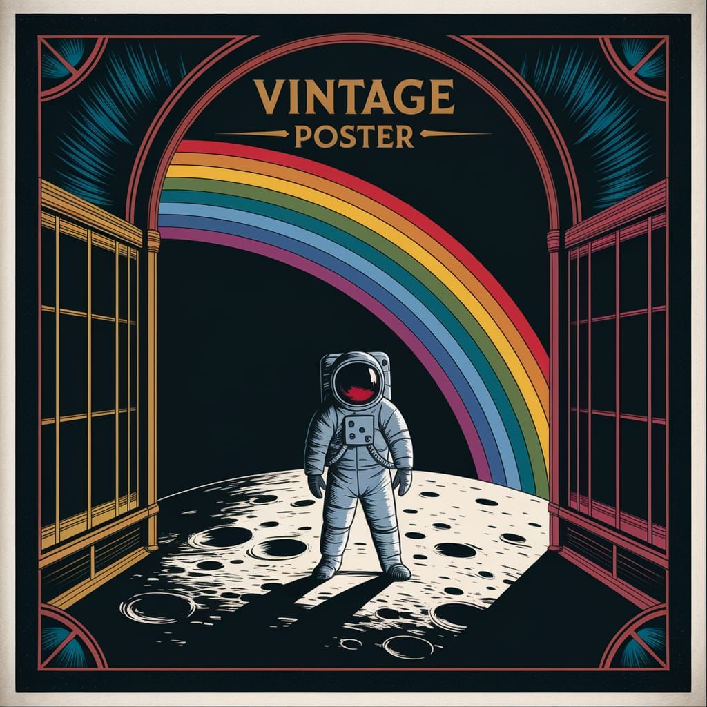 This image shows a lone astronaut on the moon bathed in rainbow light from a stained glass window. The artwork is designed in a vintage art deco style with bold typography.