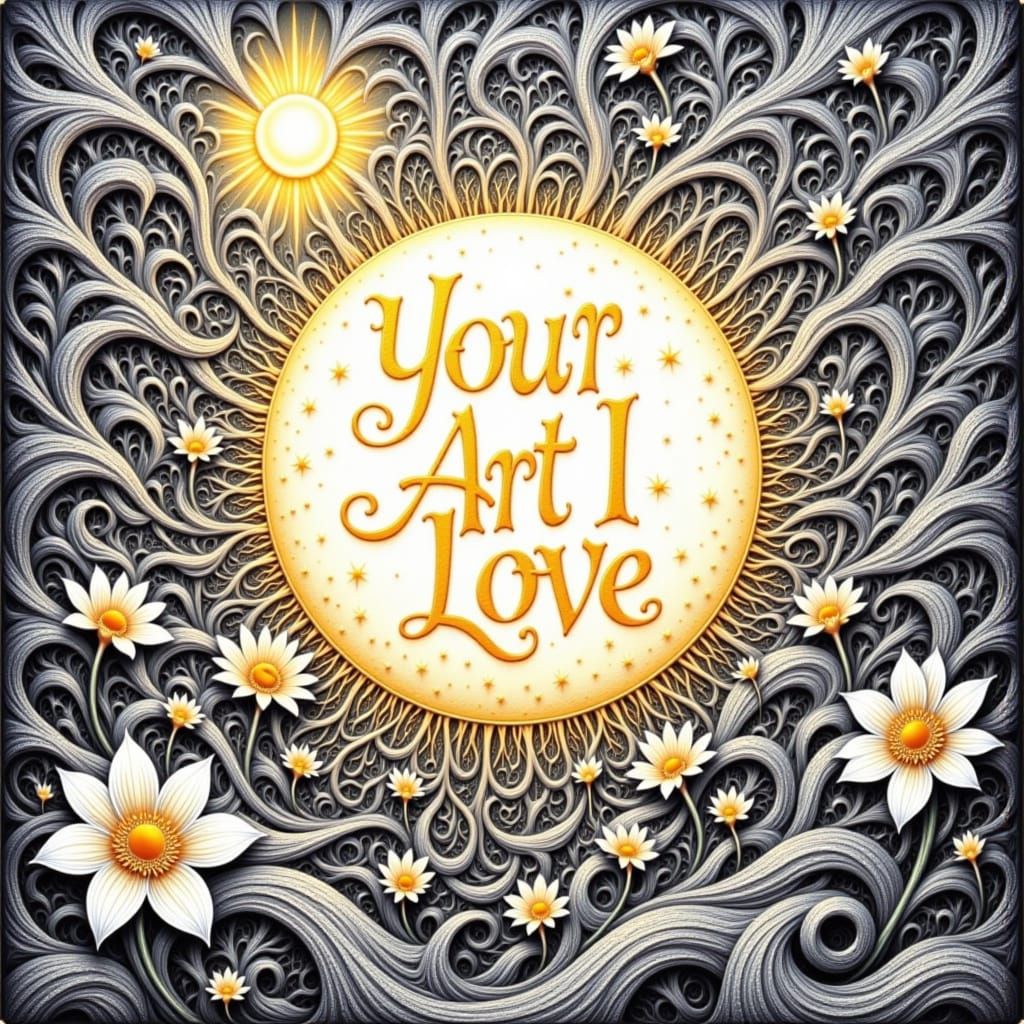 This image showcases a detailed, monochromatic pen-and-ink sketch featuring the words 'Your Art I Love' above a blooming moonflower. It is set against a surreal, Escher-inspired background with swirling patterns and impossible structures, bathed in golden light.
