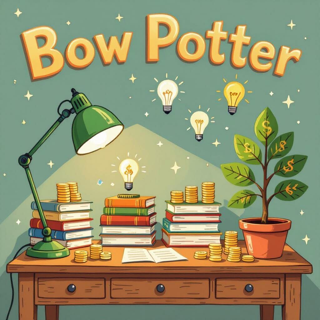 A whimsical, hand-drawn style image showing a desk with books, coins, and a money tree. The illustration features playful typography and warm lighting, reminiscent of classic children's book art.