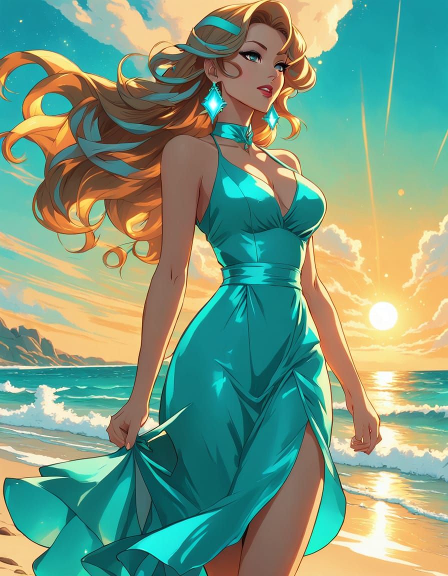 This image shows a young woman in a turquoise dress walking on a beach. The artwork features vibrant colors and soft lighting, reminiscent of anime and manga styles.