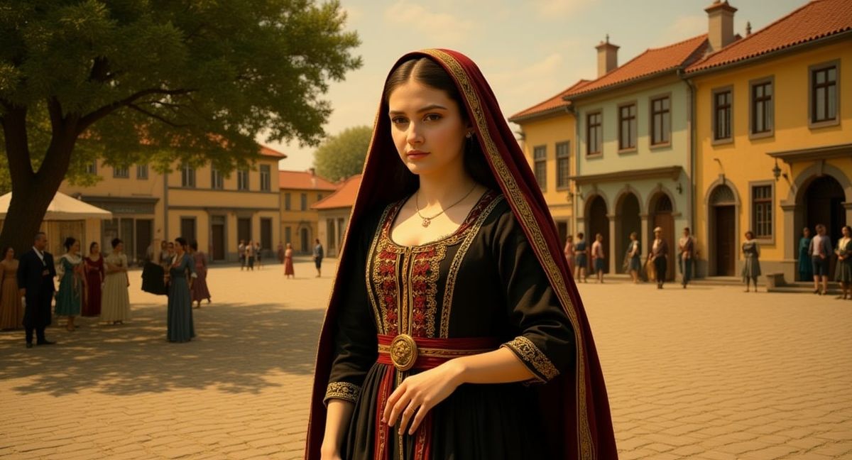 This image depicts a young Albanian woman in detailed 17th-century traditional clothing, set in a village square. Rendered with dramatic lighting and rich colors, it evokes the style of Dutch Golden Age painting.