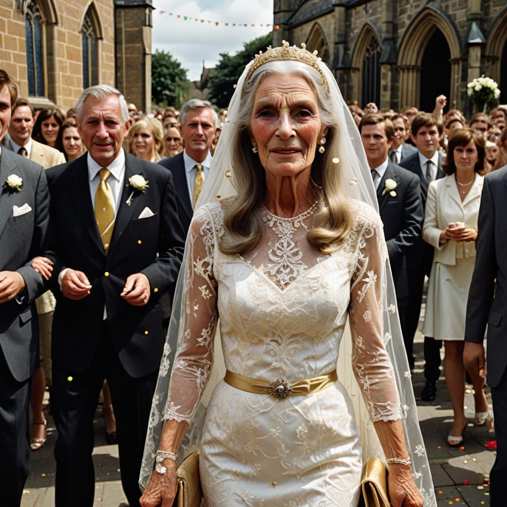 This image shows an elderly cross-dresser with golden grey hair and deep wrinkles. The figure wears a short white lace wedding dress, jewelry, and heels, while embraced by a young partner as confetti is thrown.