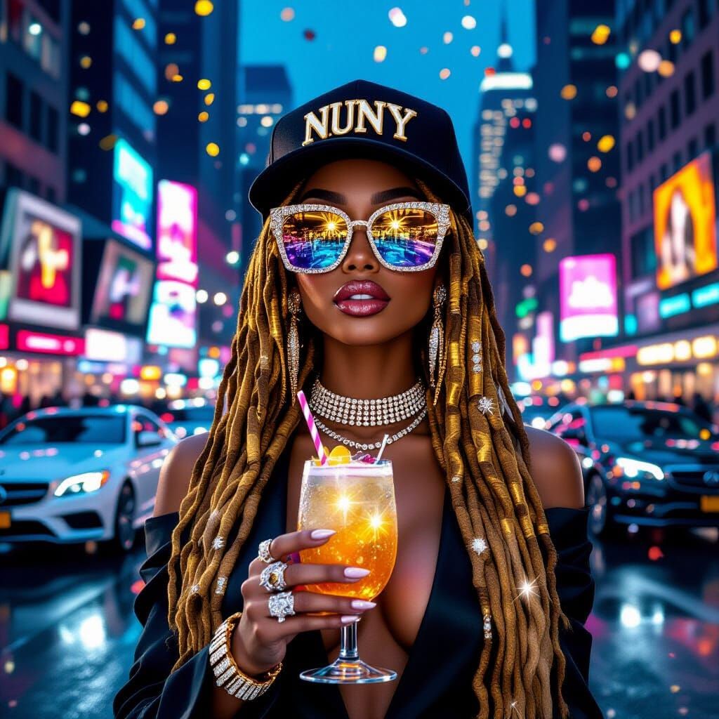 This hyper-realistic image features a stylish African American woman with golden dreadlocks holding a sparkling New Year's Eve cocktail amidst a vibrant NYC skyline. Luxury cars and festive lights enhance the celebratory atmosphere.