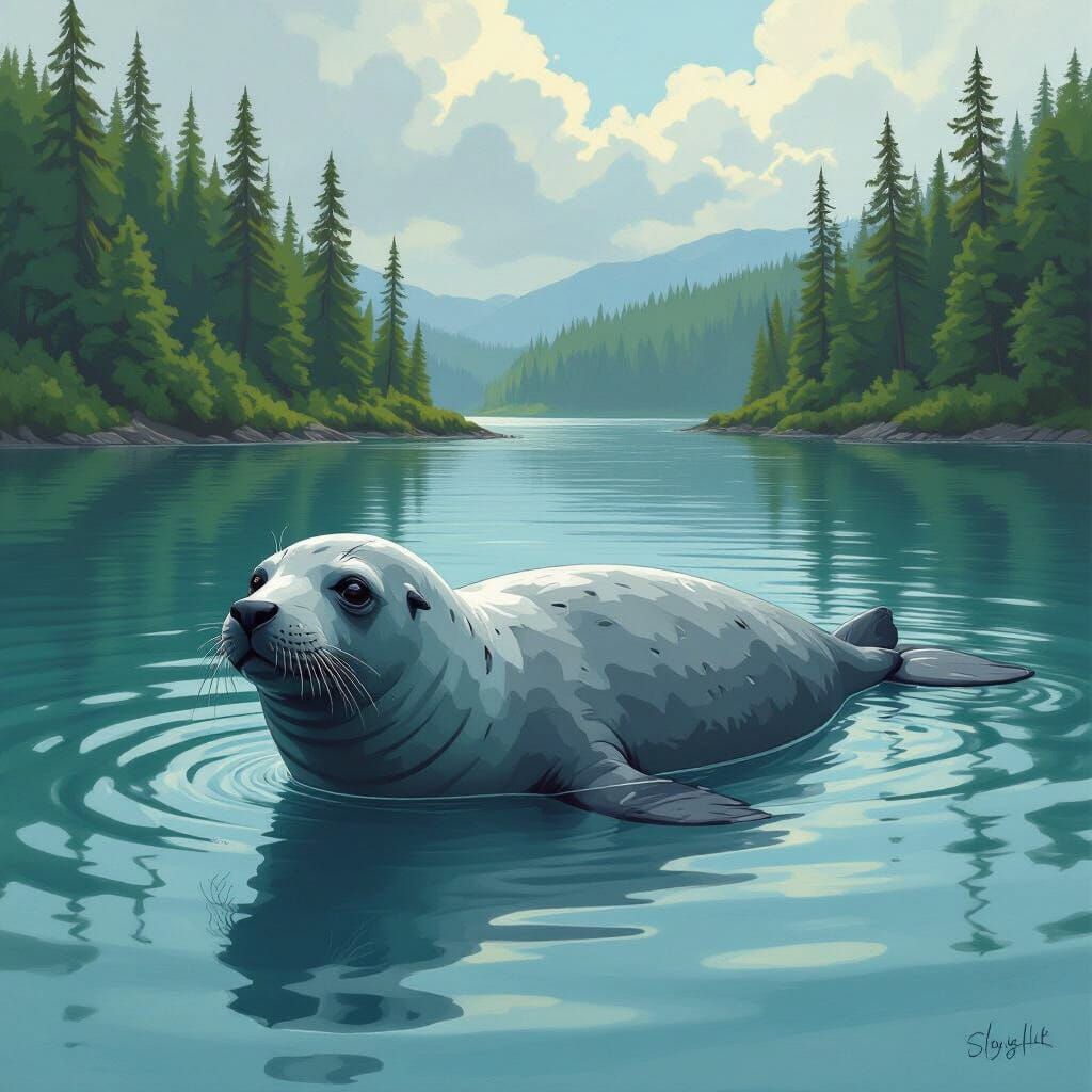 A surreal image of a giant grey seal with a dog-like face swimming in a Canadian lake. The artwork features atmospheric lighting and intricate textures, reminiscent of digital painting.