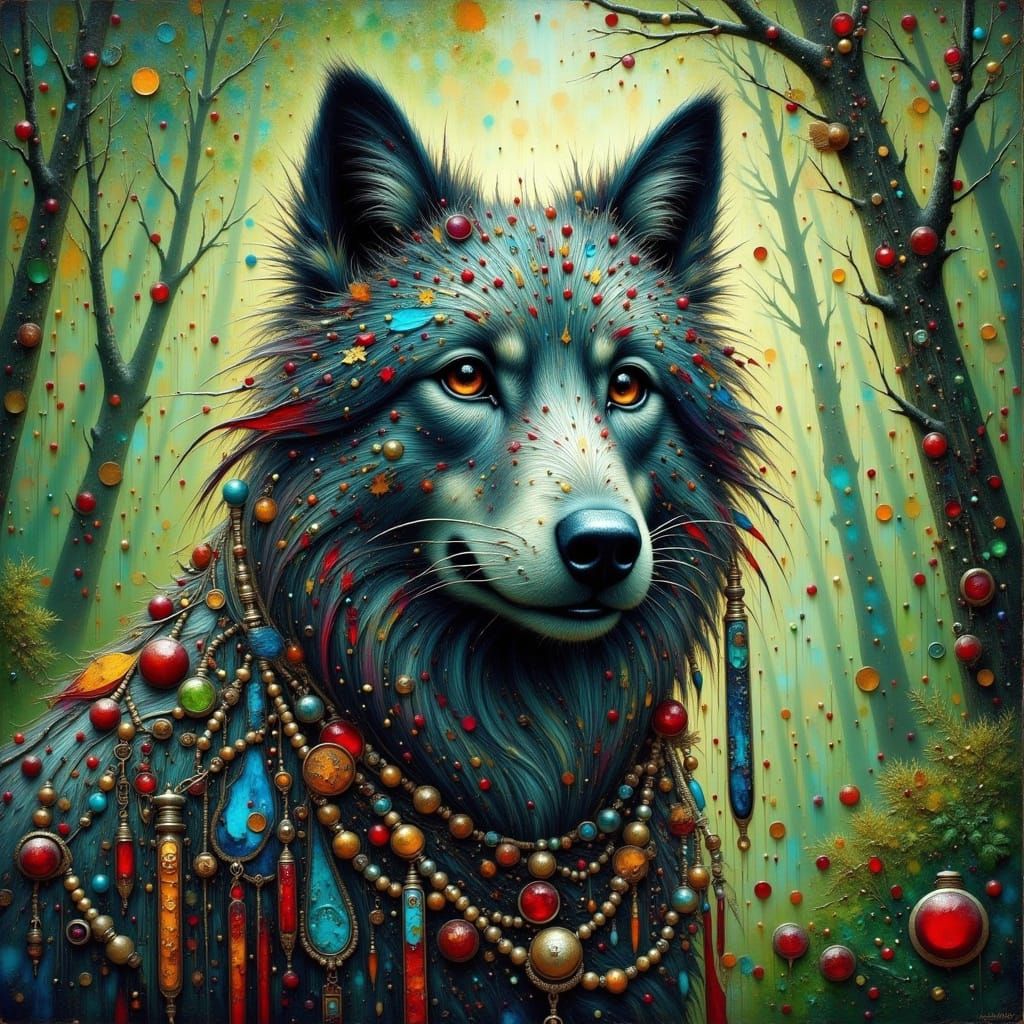 This image shows a grey wolf with striking blue eyes adorned with colorful beads and vibrant braids, standing in a lush forest. The wolf's fur features paint-splattered textures in a hyperrealistic style.