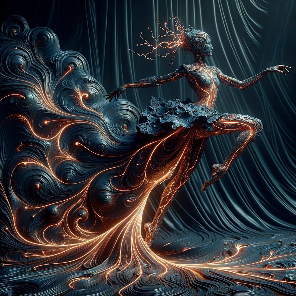 This image showcases a genderless sculpture of molten copper with glowing veins, wearing a ferrofluidic metal dress. It appears mid-leap, trailing molten metal against a blurred velvet shadow background, in an enigmatic realism style.
