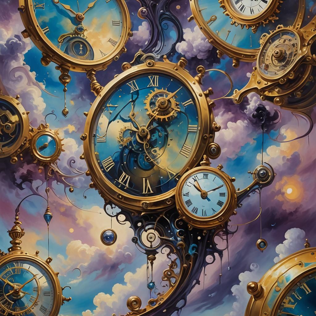 A surreal oil painting of clocks dancing in a void filled with swirling clouds. The artwork features dripping clockwork and a dreamlike atmosphere with Gurney-inspired atmospheric lighting.