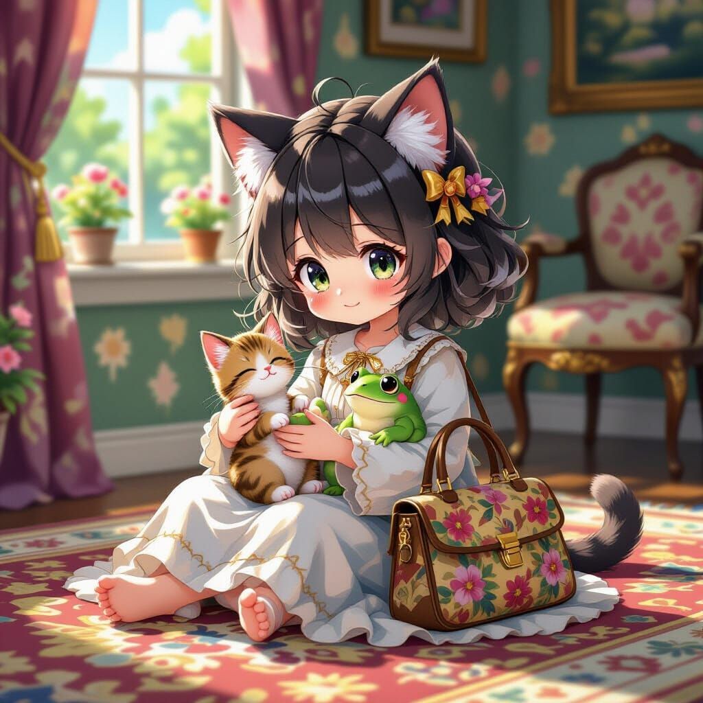 This detailed anime drawing features a girl with cat ears holding a kitten and frog. The artwork combines gouache and watercolor with impasto techniques for a textured, maximalist impressionist effect and vivid colors.