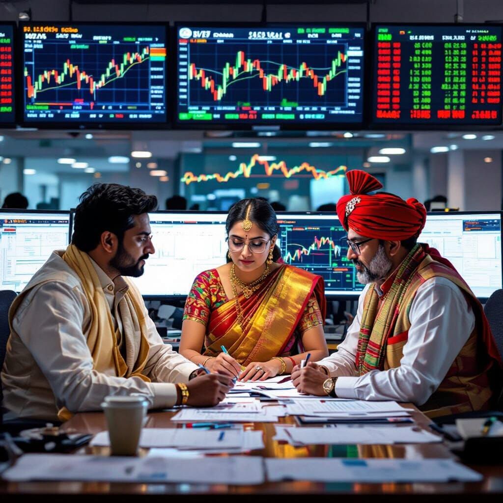 A vibrant image depicts investors and brokers in traditional Indian clothing analyzing stock market data in a modern Mumbai office. The scene, reminiscent of Bollywood, features realistic lighting and a blend of concern and focus.