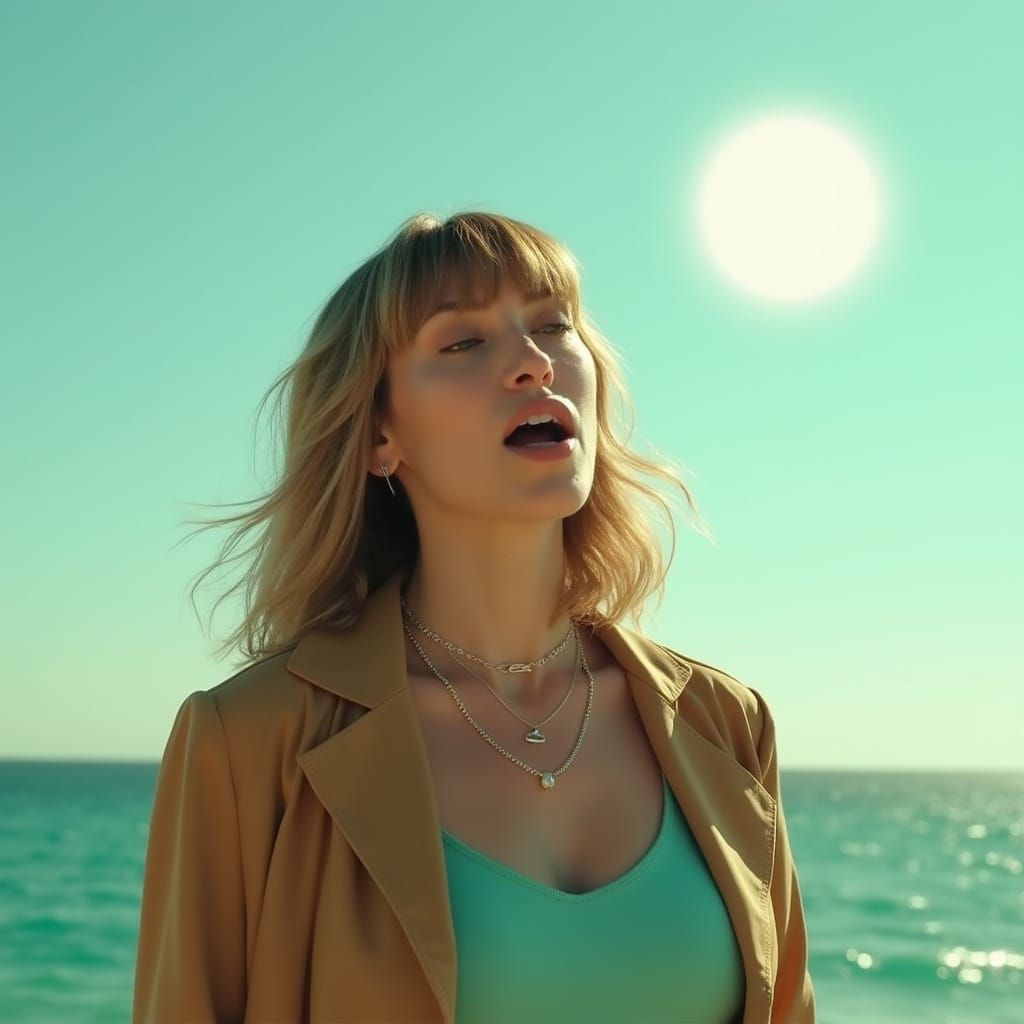 A dreamy woman stands in front of a vibrant sea glass green sky, her enchanting presence illuminated by a brilliant white sun. She wears a tan jacket, turquoise tank top, and silver jewelry, her sea green eyes shining with passion.
