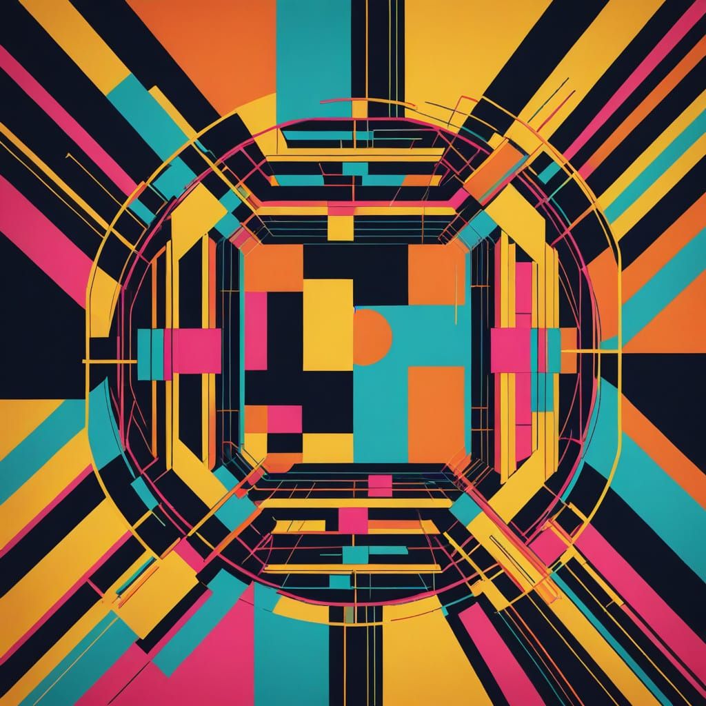 This image showcases a vibrant pop art screen print of Krell holding C4. The artwork features geometric Bauhaus style, neon accents, crisp digital lines, and triadic colors under golden hour lighting.