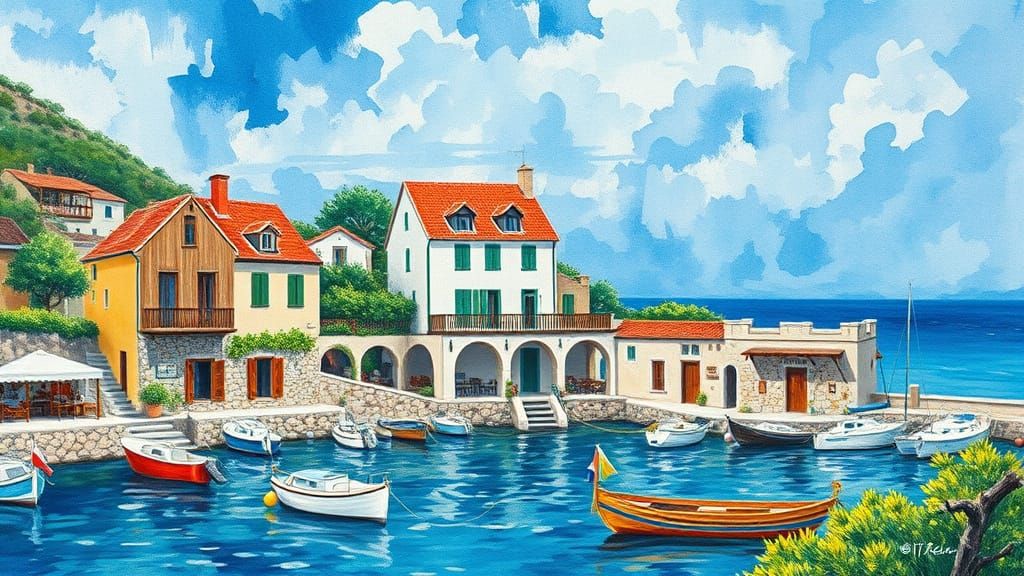 A picturesque scene of a guest house surrounded by the ocean, boats, and charming stone buildings, reminiscent of a watercolor painting in the style of Vincent Van Gogh's neo-impressionism, with thick layers of textured paint and a sense of expressionist charm.