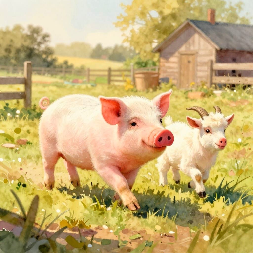 This charming watercolor image depicts a small piglet playfully running through a farmyard, with a baby goat close behind in pursuit.
