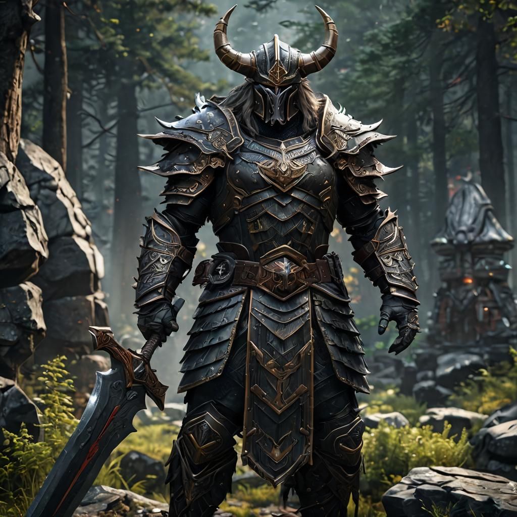 A striking picture of a god of weapons in obsidian armor. The vertical composition features intricate details, vibrant colors, and shimmering cinematic effects, rendered as maximalist 3D art.