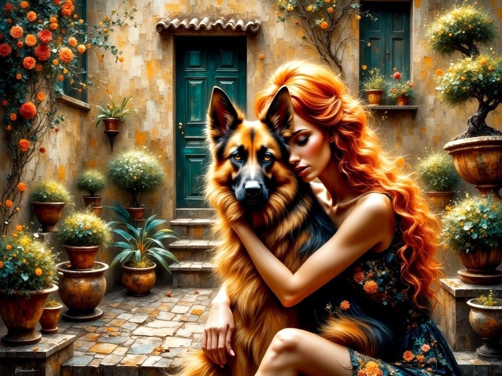 A close-up of an Art Deco woman embracing her German Shepherd in a lush Italian courtyard garden, surrounded by flowers, pots, and a bonsai tree, captured in a soft focus, impasto style with magical lighting