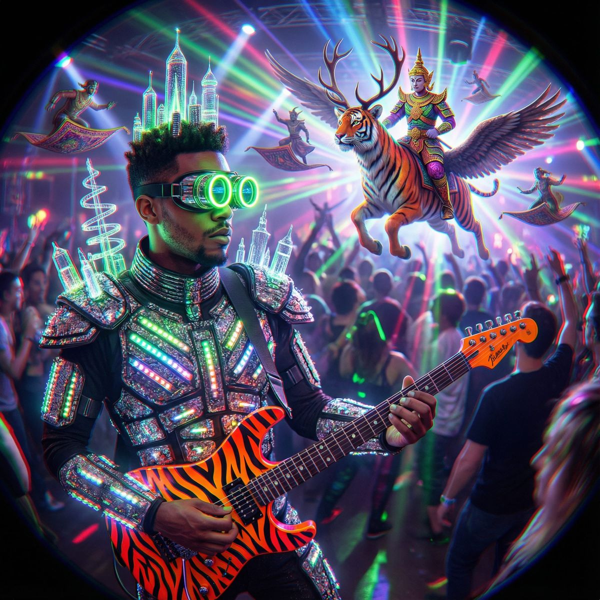 This image shows a futuristic sci-fi scene with a hyper-detailed, psychedelic humanoid figure. He wears neon armor and plays a glowing electric guitar at a vibrant rave party.