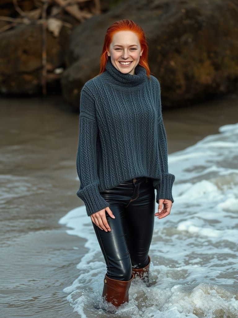 A young woman emerges from the surf, smiling mischievously as she revels in her spontaneous spring morning swim, her vibrant clothing and hair reflecting the cool, sunny atmosphere.
