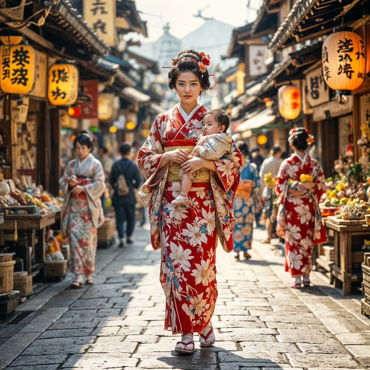 This image shows a young Japanese woman with her daughter in a bustling market square reminiscent of the Tang Dynasty. The scene is filled with vendors and shoppers, captured in cinematic style.