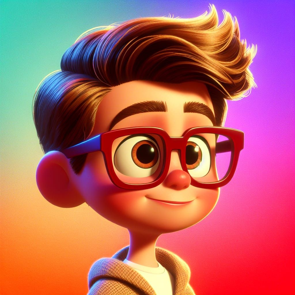 This image features a tall 10-year-old boy with mixed brown and blonde hair, wearing red glasses. It is rendered in a 3D animation style with a bright, radiant gradient background and a cinematic feel.