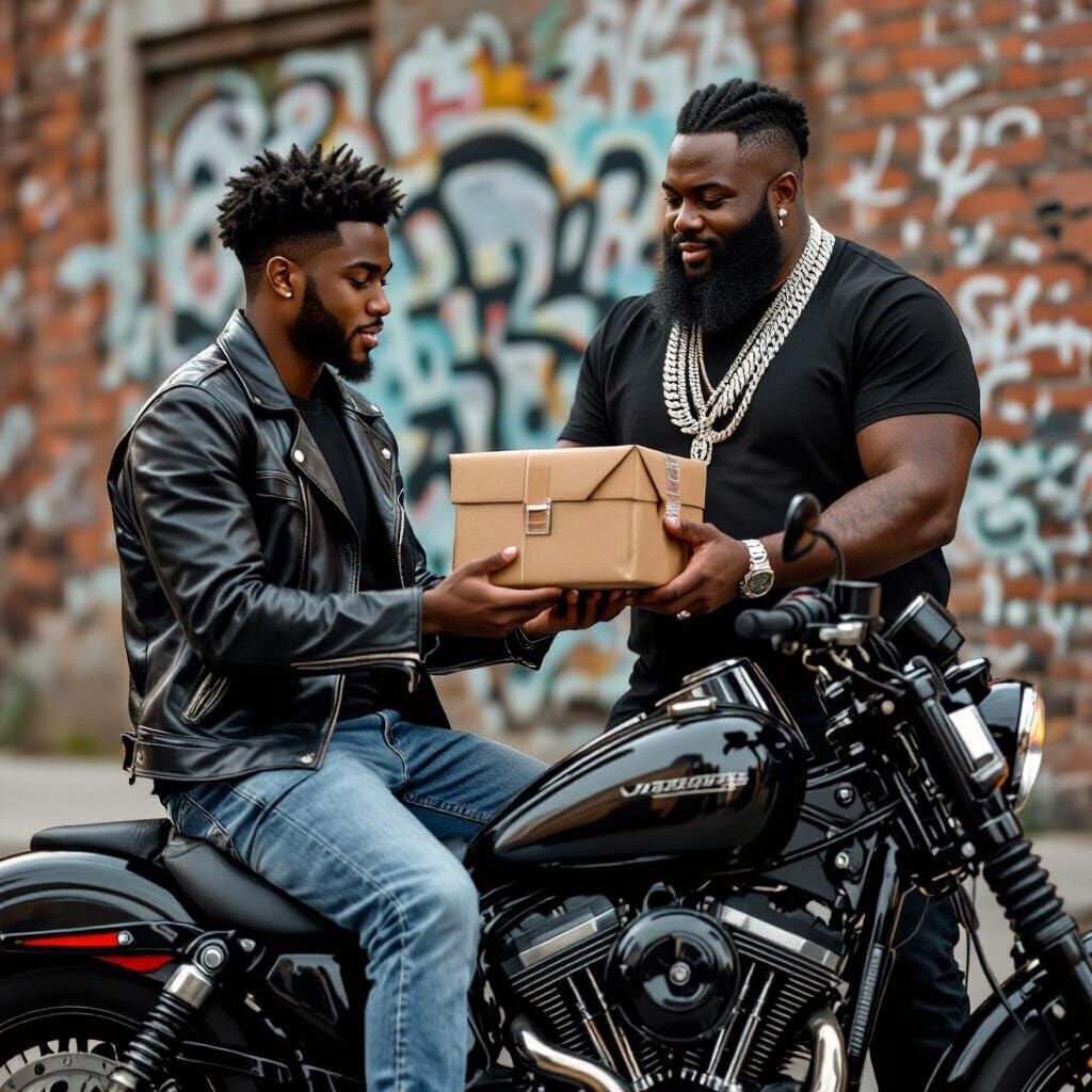 A young Black man on a motorbike receives a parcel from a bearded, stout figure adorned with silver chains. The scene is rendered with bold colors and striking detail.