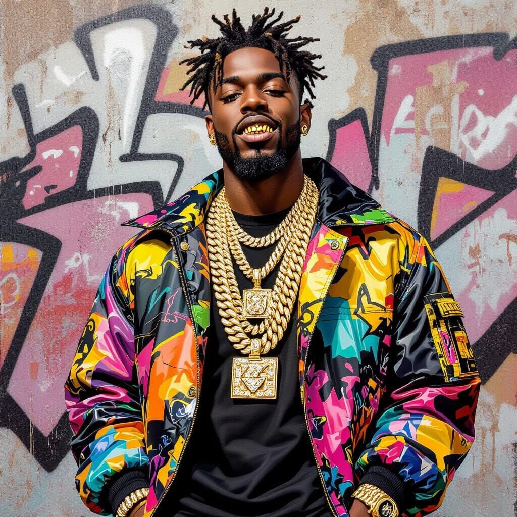 A vibrant image of a Black man confidently posed against a graffiti backdrop. The artwork blends hip-hop aesthetics with expressive brushstrokes, reminiscent of contemporary portraiture.