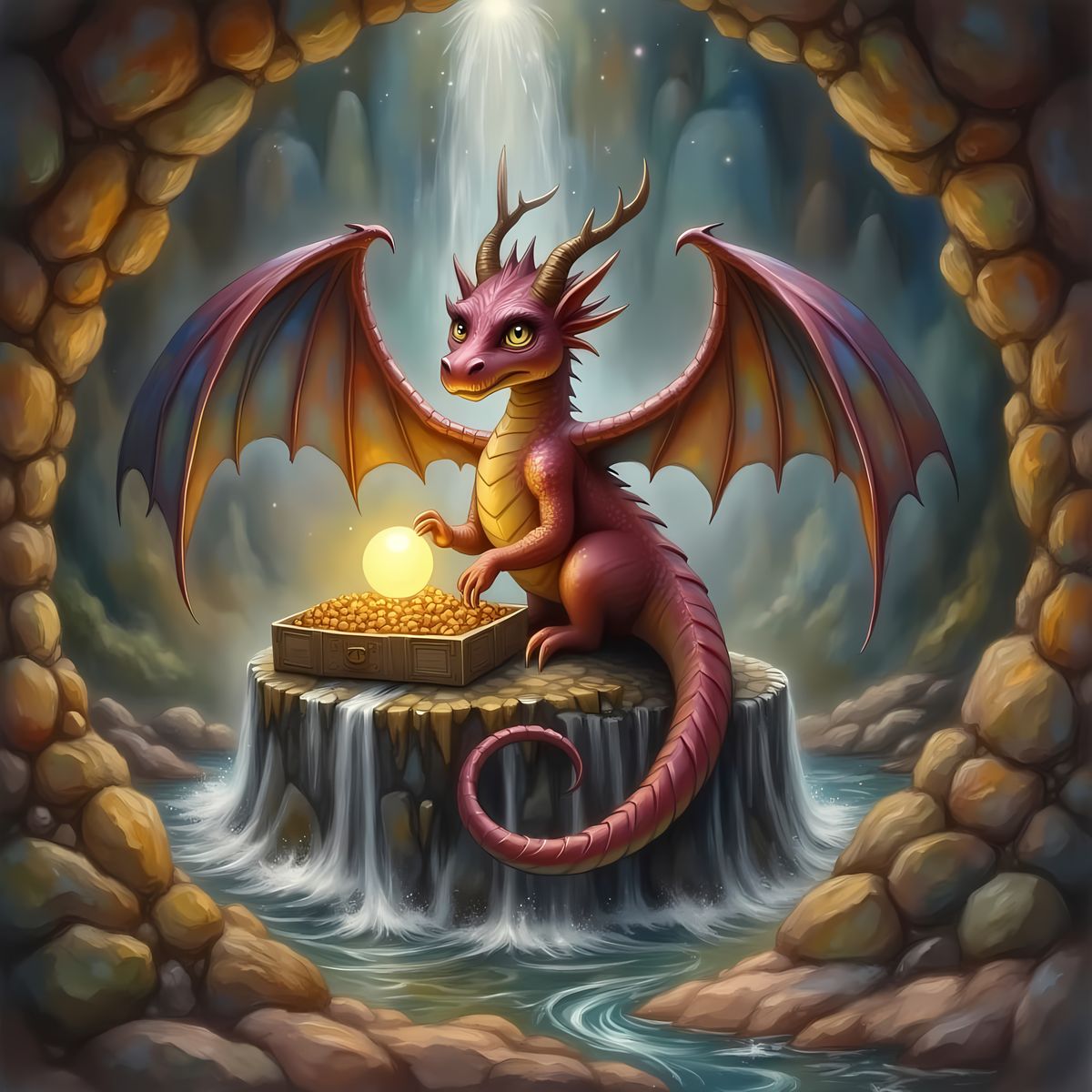 This image shows a vibrant, magenta dragon guarding its treasure. The dragon is perched inside a cave, illuminated by a magical orb, with a waterfall visible in the background. Rendered as watercolor art.