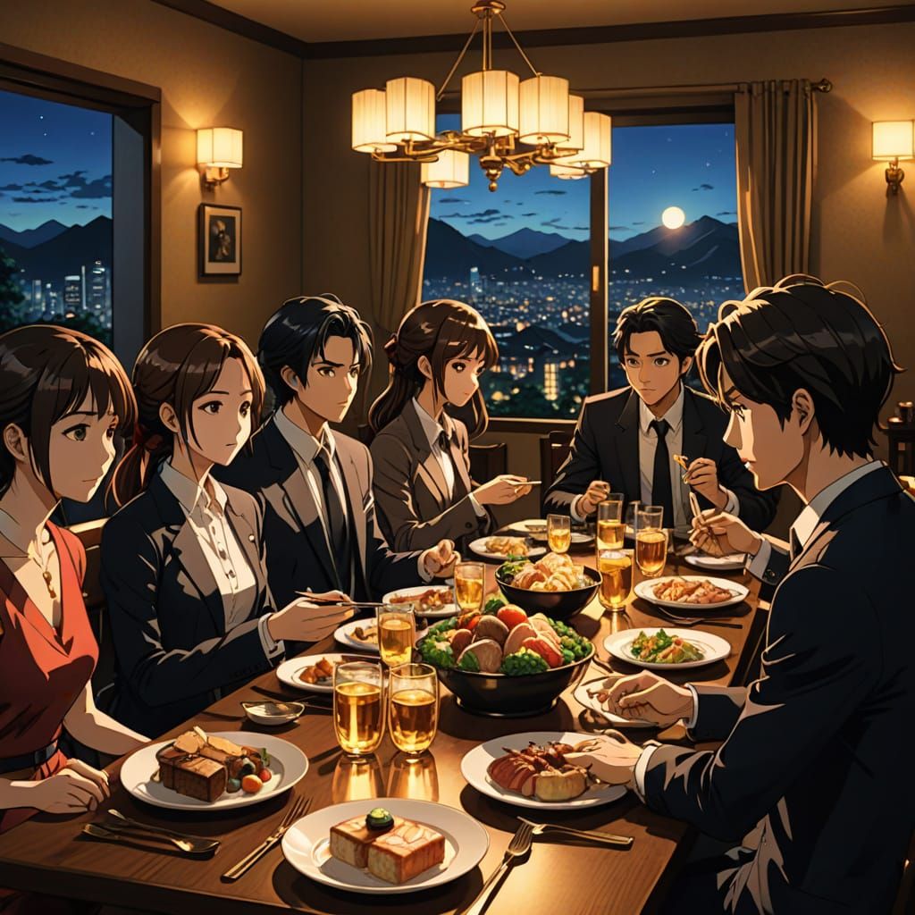 This image shows a romantic dinner party scene in a vibrant, cel-shaded anime style, with couples enjoying fine dining and CVS luxury goods in a rich, golden lighting atmosphere.