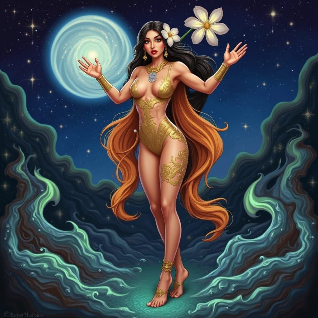This image shows a striking woman with dark hair against a starry sky. She wears a silver medal, and her clothing features fractal patterns, all rendered with digital art techniques.
