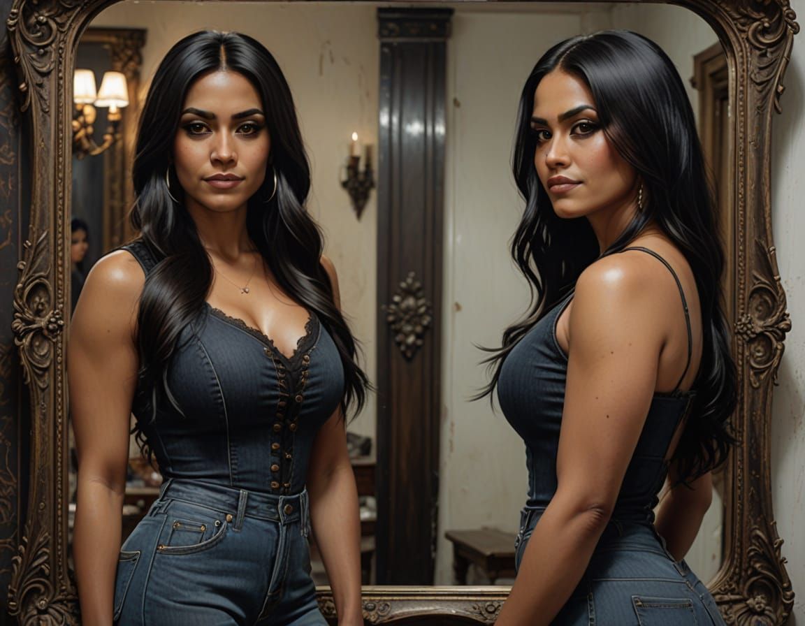 A hyperrealistic image of a curvy Mexican woman. One side shows her in casual jeans and shirt, the other in a gothic dress, both sensual and smiling.