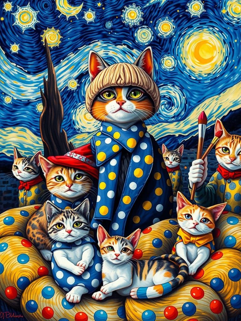 A vibrant image of cats in a surreal, swirling dreamscape. The artwork evokes bold brushstrokes and mesmerizing patterns, with colorful fur and artistic expression in a fusion aesthetic.