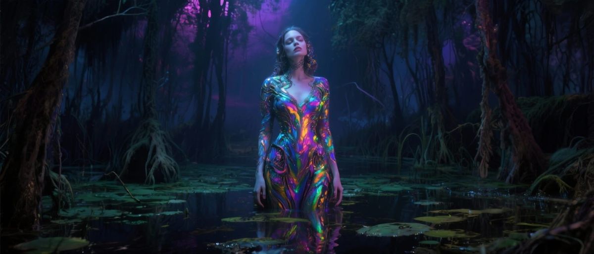 This hyperrealistic dark fantasy image depicts a woman in a swamp, glowing with iridescent colors under dramatic cinematic light. It features a saturated palette with deep shadows and highlights, evoking a fever dream.