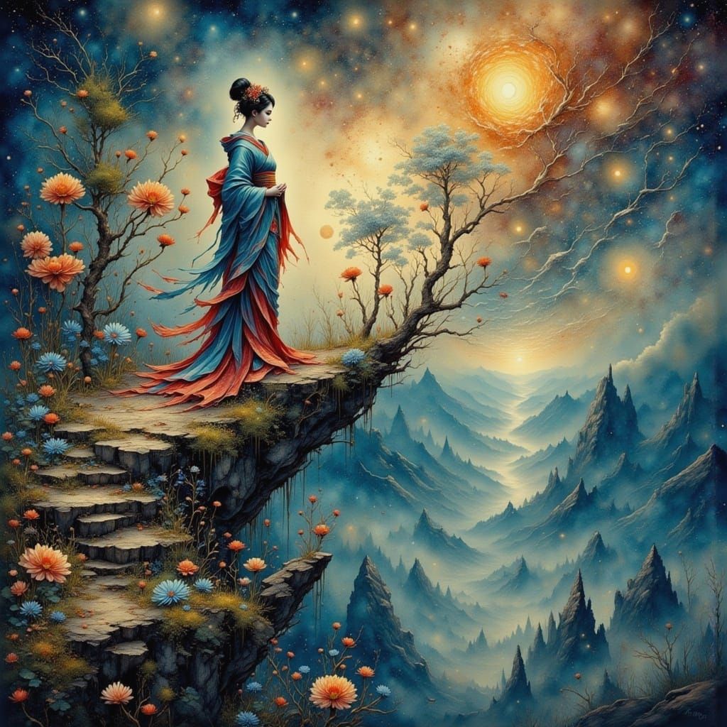 <lora:MrsH Delicate Fae:1.0> <lora:MrsH Watercolor:1.0> <lora:Antique Watercolor 2:1.0> <lora:Akimora:1.0> A lone geisha, her face a mask of serene contemplation, stands on a precipice overlooking a swirling nebula of cosmic dust and starlight. The landscape below dissolves into a fluid, abstract representation ...