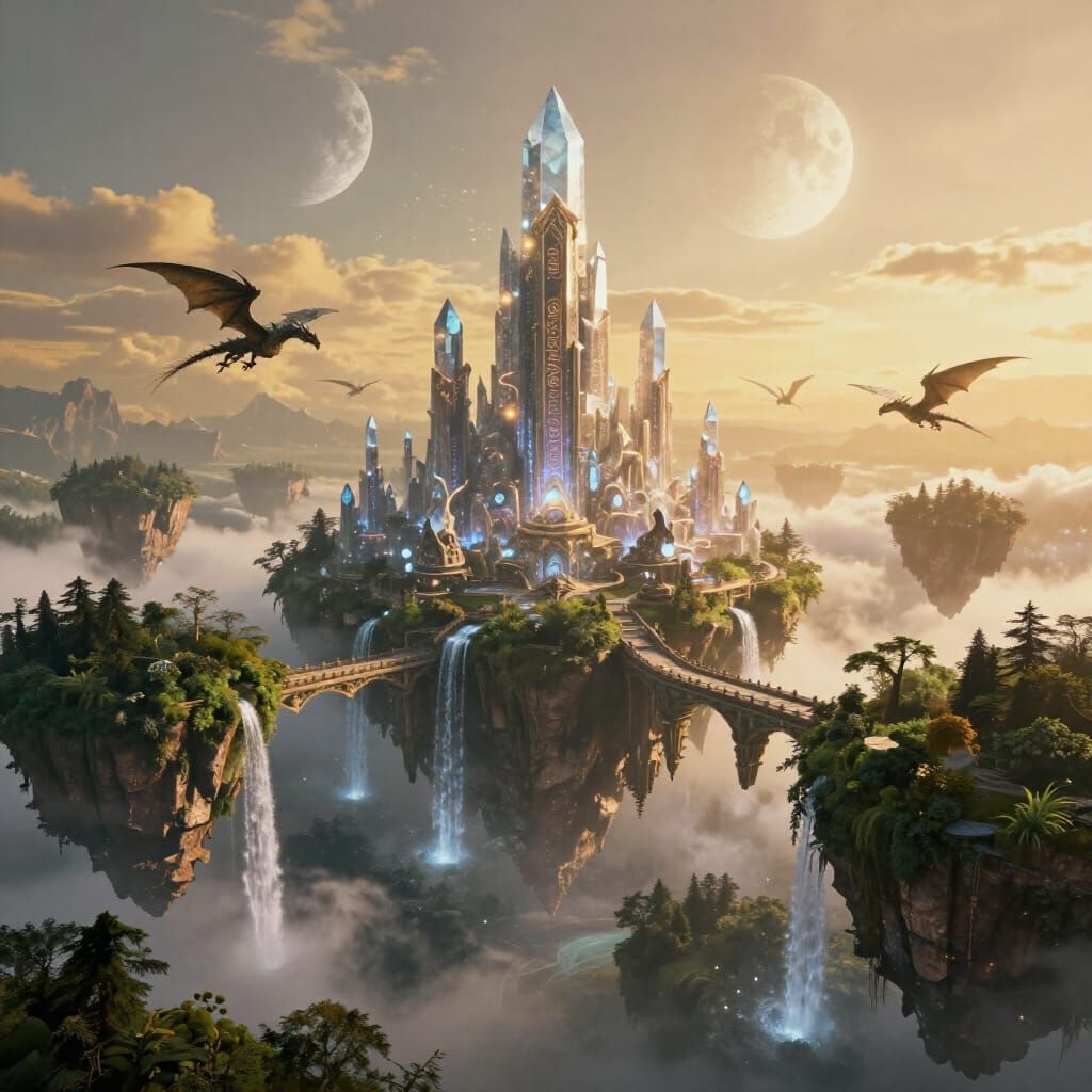 This image depicts a vast, ancient fantasy world with floating islands, lush forests, and glowing waterfalls. A grand crystal city with rune-carved towers is central, connected by mist-shrouded bridges. Dragons fly in a sky with two moons, rendered in a detailed, cinematic style.