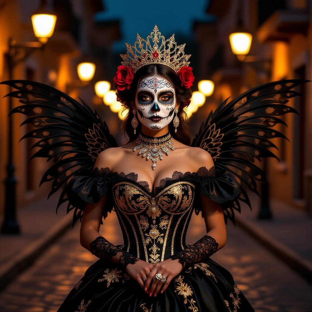 A hyper-realistic portrait of a mysterious queen in intricate sugar skull makeup and a regal corset gown, bathed in warm golden streetlights with bokeh. Cinematic and ethereal.