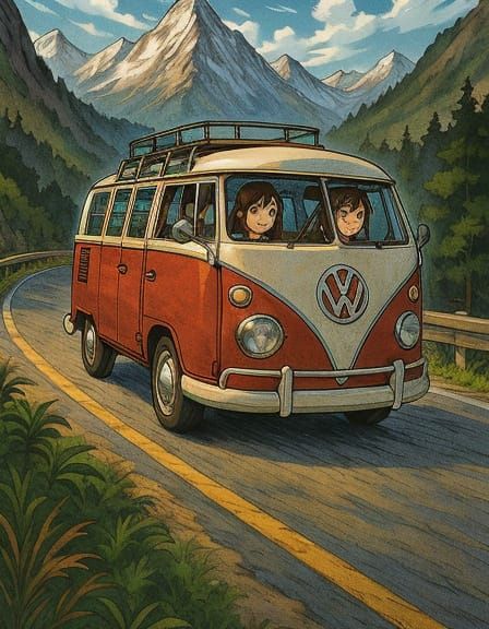 This image shows a colorful manga-style illustration of a Volkswagen camper van driving through a scenic mountain landscape. The artwork features vibrant colors and bold lines.