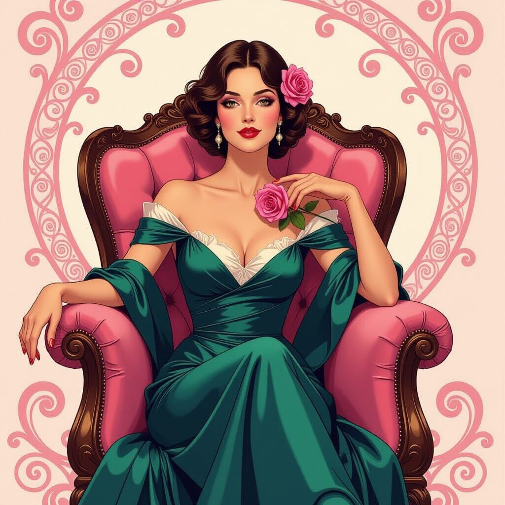A captivating image of a woman in elegant clothing holding a pink rose. The background features soft pink swirls in an art nouveau style with vibrant colors and delicate lines.