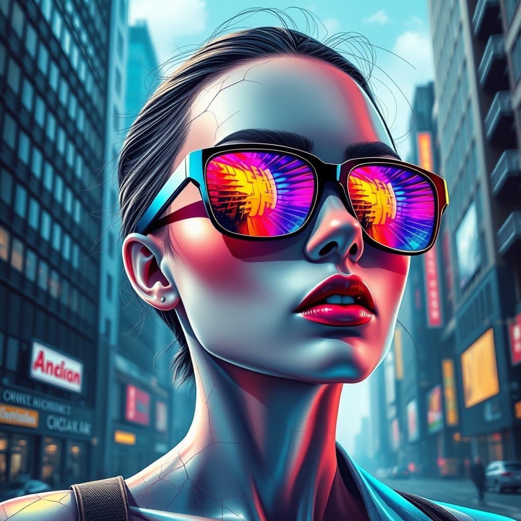 A digital artwork of a woman with shattered glass skin reflecting a rainbow. She wears sunglasses which also reflect the rainbow, set against a futuristic city in a hyper-realistic style.