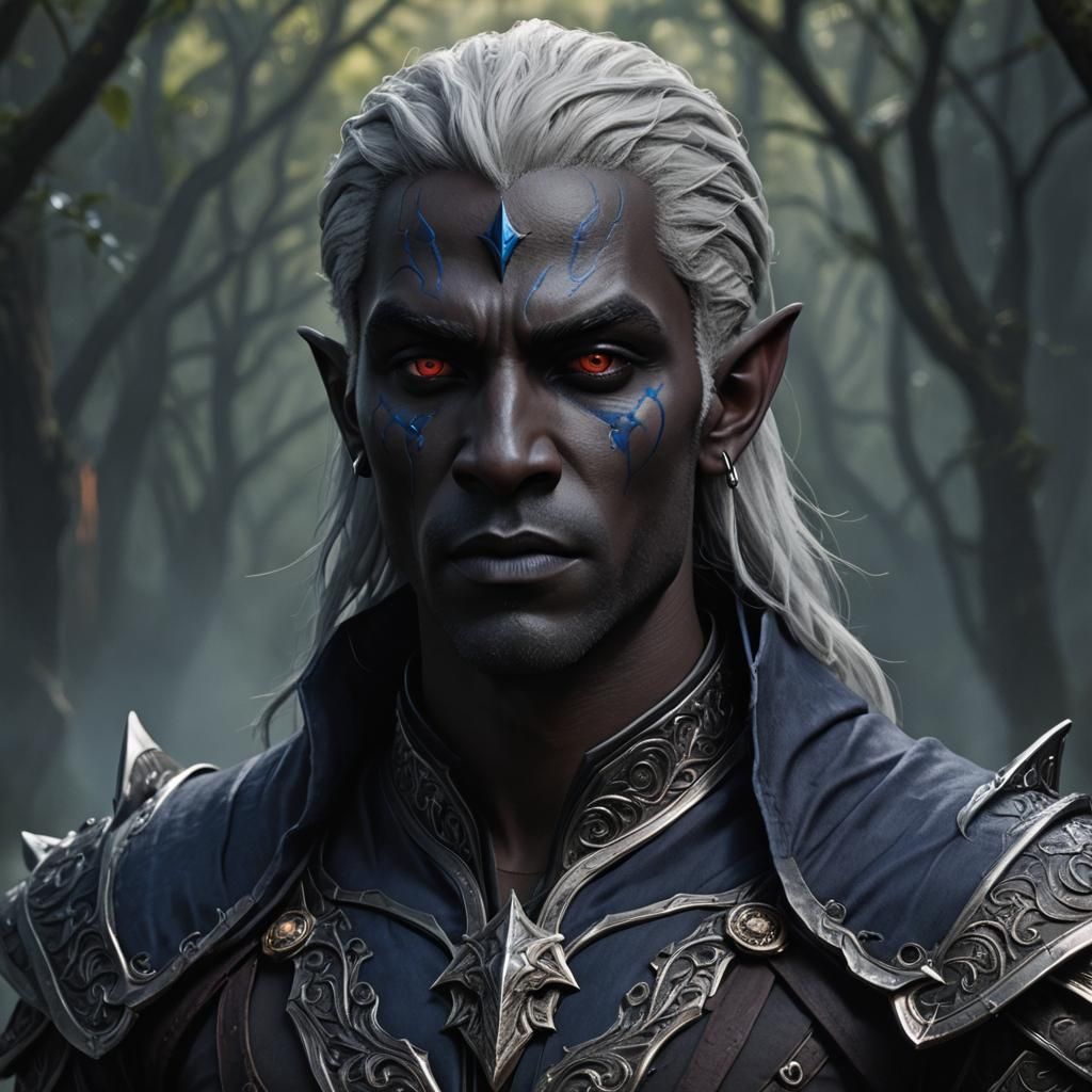 A detailed portrait of a male drow warrior with subtle human features. The image is rich with deep color and intricate details, rendered as fantasy concept art.
