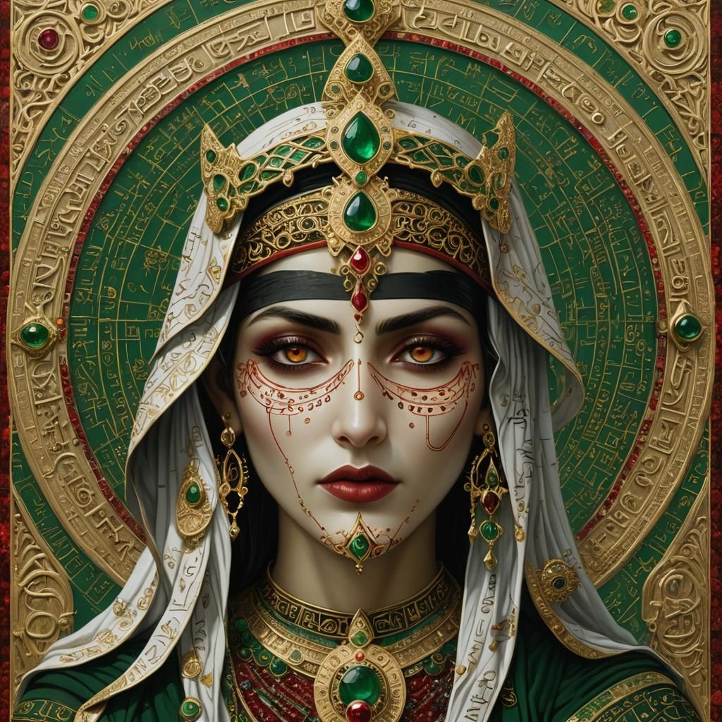 A striking picture of a Kabbalistic female figure adorned with sacred scripts and a gold pendant. The image features glowing eyes, rich colors, fantasy details, and soft, golden lighting in a matte painting style.