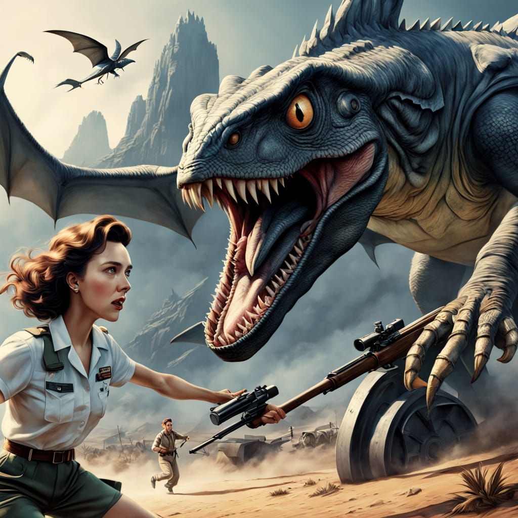 A vintage black and white movie poster depicting a terrifying pterodactyl attack. Features a woman in 1950s attire recoiling in fear as a soldier fires at the creature.