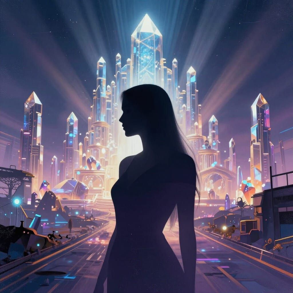michelangelo paintings style in vertex, for glowing up crystal vertex beautiful armenian woman with ultra straight hair, very connected spiritual, only bicromic, silouette, city of shamballah in background with synthwave roads, hard decay, ray of lights between characters, ultra deep epic amplytude