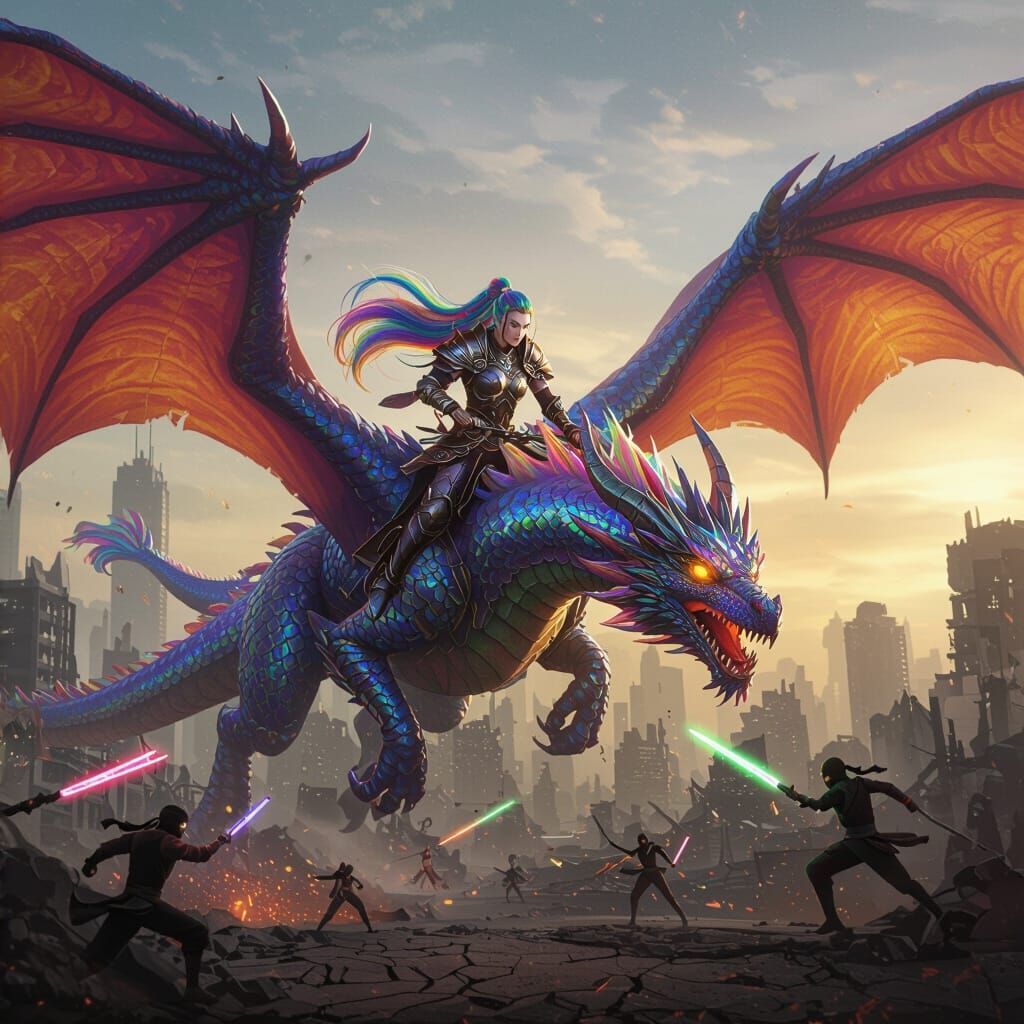 This image shows a fierce anime warrior on a massive, iridescent dragon soaring above desolate city ruins. Features dynamic action, cel-shaded style, and cinematic lighting.