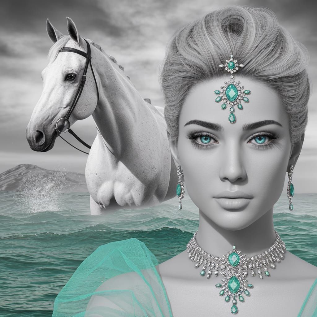 This image depicts a woman in a turquoise dress and eyes standing next to a white horse, all set against a greyscale background. The turquoise jewel and sea provide a striking contrast.