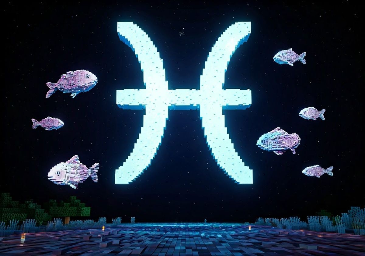 This image depicts a vibrant, dreamlike scene of the Pisces Zodiac symbol constructed from intricately arranged Minecraft cubes, set against a starry night sky of shimmering, iridescent colors, evoking a sense of mesmerizing wonder and futuristic digital art.
