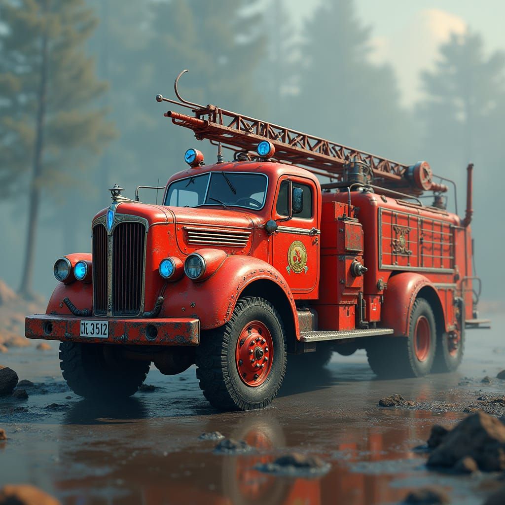 A fire truck reimagined in a gritty, futuristic steam punk world, with vibrant colors and intricate details, blending Soviet-era propaganda and science fiction elements.
