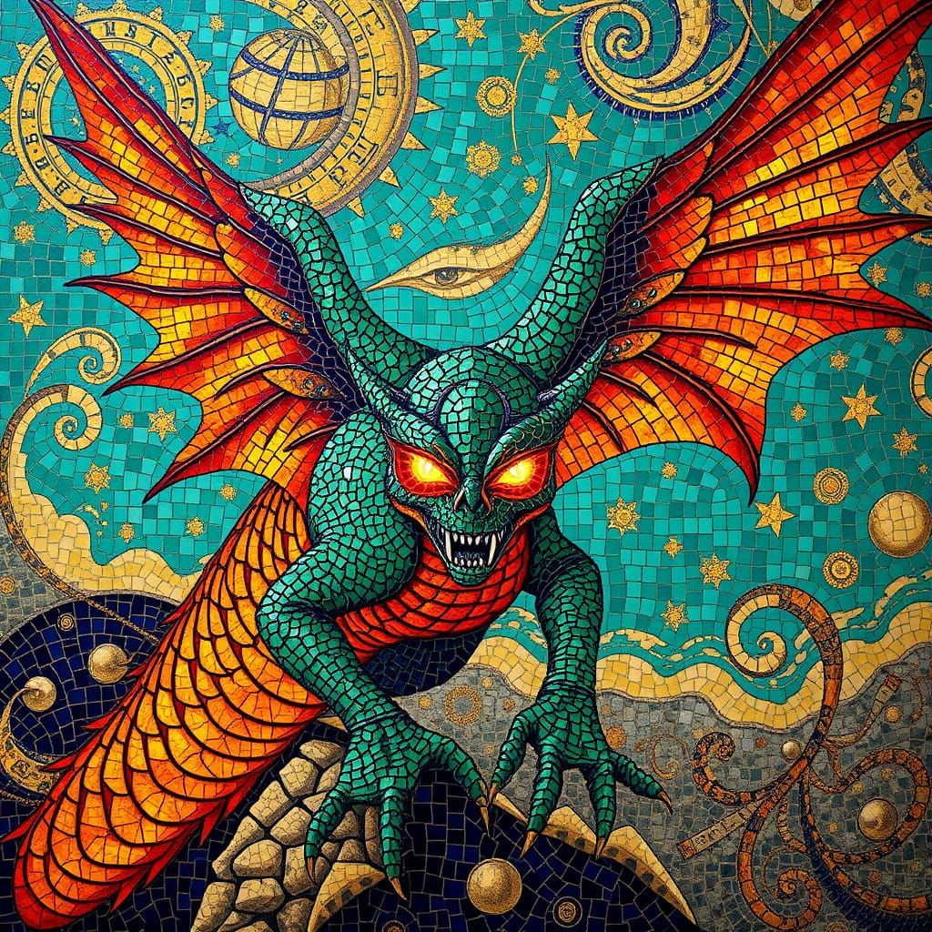A striking picture of a winged mosaic creature against a celestial backdrop. This artwork features rich jewel tones and intricate tilework in a Byzantine and Art Nouveau style, evoking a sense of ancient majesty.