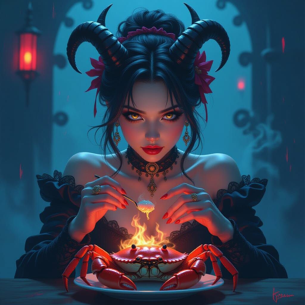 This image shows a demon girl enjoying a crab in a mystical setting. The artwork features vibrant neon accents and dynamic brushstrokes in a gothic aesthetic.