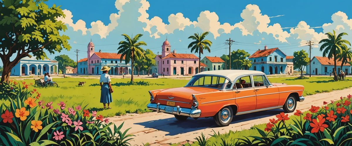 This image is a vintage travel poster of Cuba, painted in a quaint folk art style with soft, dreamy colors and a vast sky. Features bright afternoon daylight.