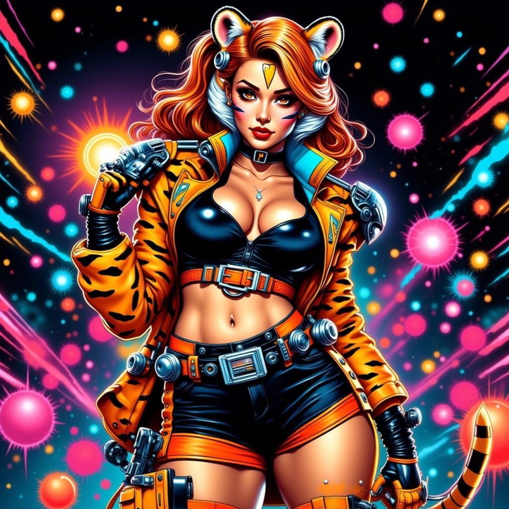 This image shows an anthropomorphic tiger-human hybrid in a dramatic pose. The character has vibrant orange and black fur and wears a cyber-enhanced outfit in a pulp comic aesthetic.