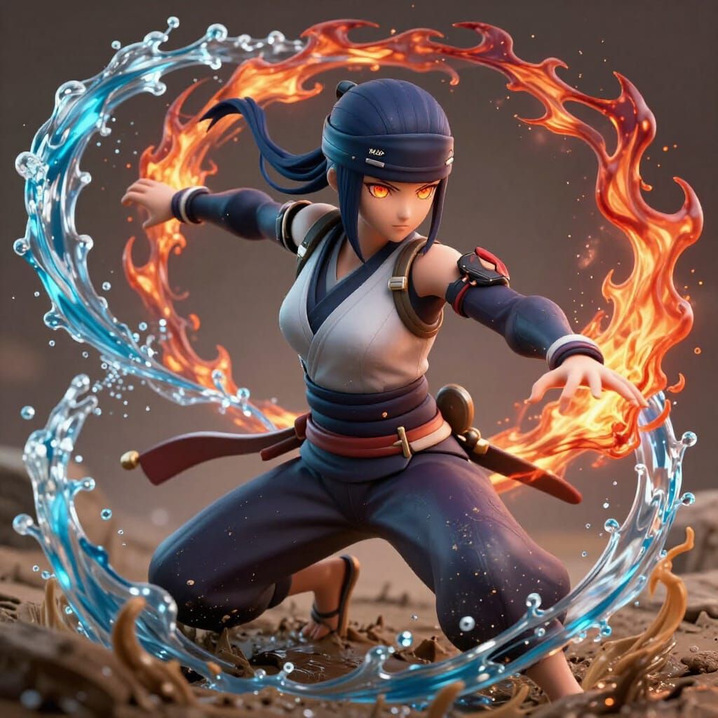 This image depicts an anime ninja woman wielding water and fire, with intense eyes and fluid movement. Rendered in a detailed 3D anime art style, it captures a dynamic and powerful presence.